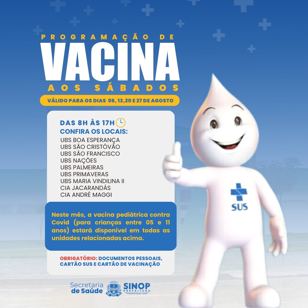 A Secretaria de Saúde de Sinop seguirá ofertando, aos sábados de agosto, todas as vacinas de rotina previstas no Plano Nacional de Imunização, contra Covid-19 e, também, contra gripe.
