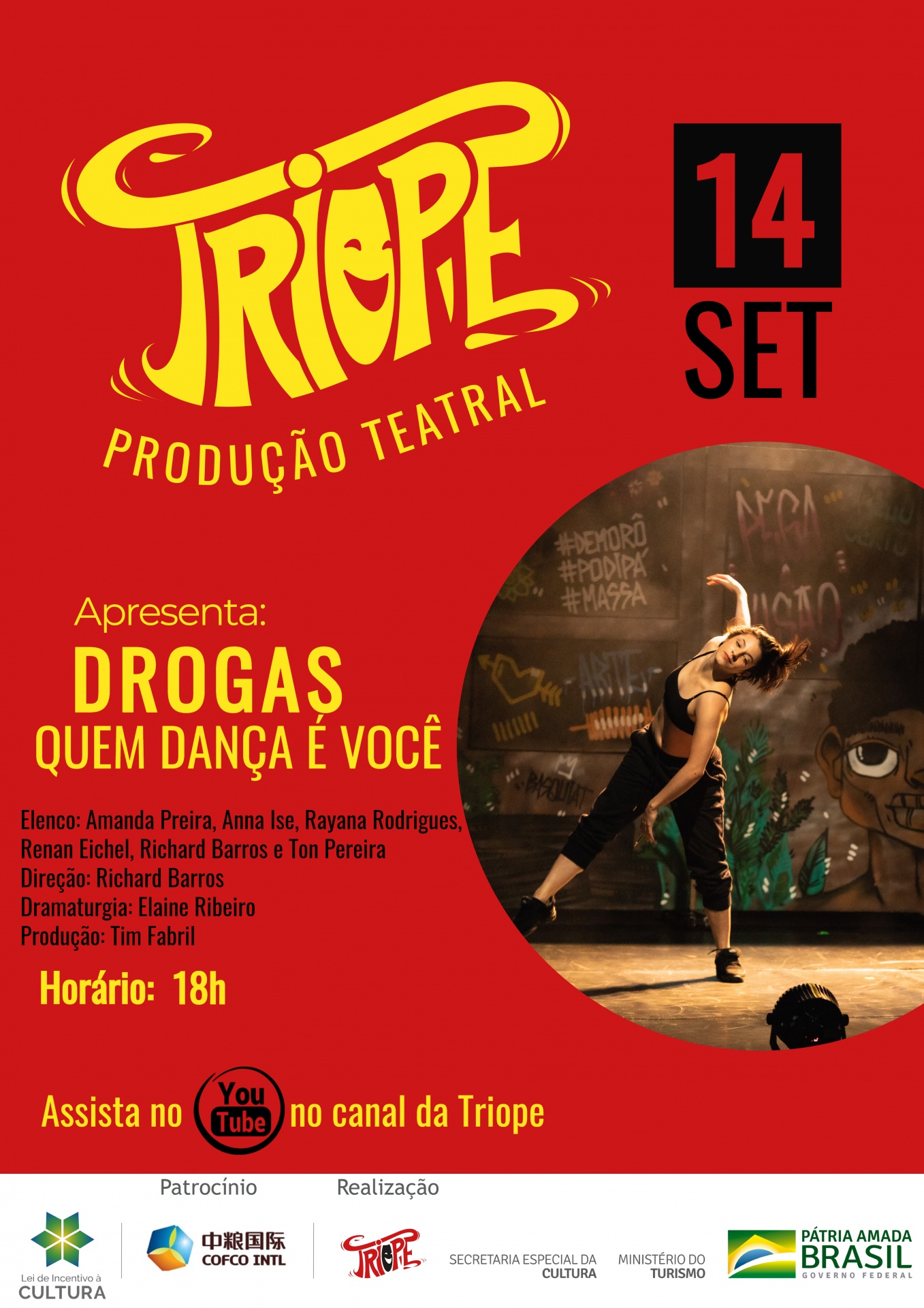 Com realização do Ministério do Turismo, Secretaria Especial da Cultura e Triope Produção Teatral, o espetáculo “Drogas: Quem Dança é Você” será transmitido gratuitamente pelo canal do YouTube da Triopeteatral.