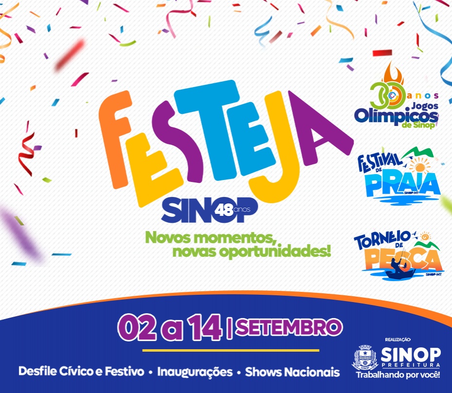 Sinop está comemorando 48 anos e, para celebrar, a Prefeitura preparou uma vasta programação, com shows nacionais, continuidade e retomada de eventos consagrados como a 30ª edição dos Jogos Olímpicos, baile da cidade e semana cívica.