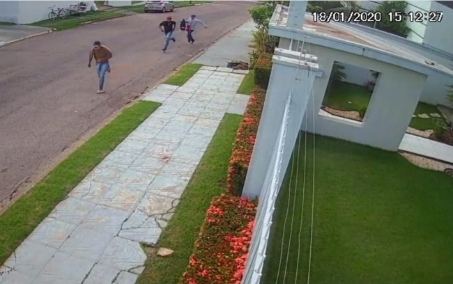 Câmeras de segurança de uma casa vizinha registraram o momento em que os suspeitos fogem correndo do local. Polícia Militar faz diligências para tentar localizar os criminosos.