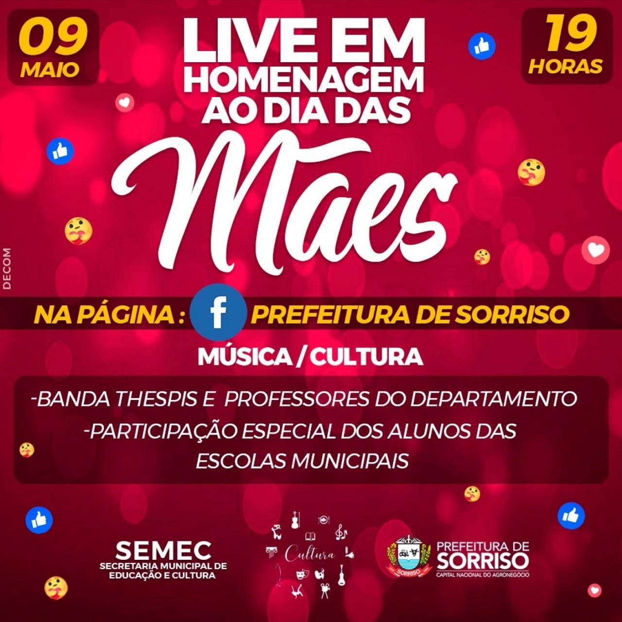 Graças à tecnologia, filhos podem homenagear, mesmo à distância, a mulher mais importante de suas vidas: aquela que lhes deu a vida, a mamãe. Para homenagear as mães sorrisenses, a Prefeitura de Sorriso, por meio da Secretaria de Educação e Cultura (Semec), promove neste sábado (9), às 19h, uma live na página oficial da Prefeitura no Facebook, recheada de ternura, amor e muito, muito talento.