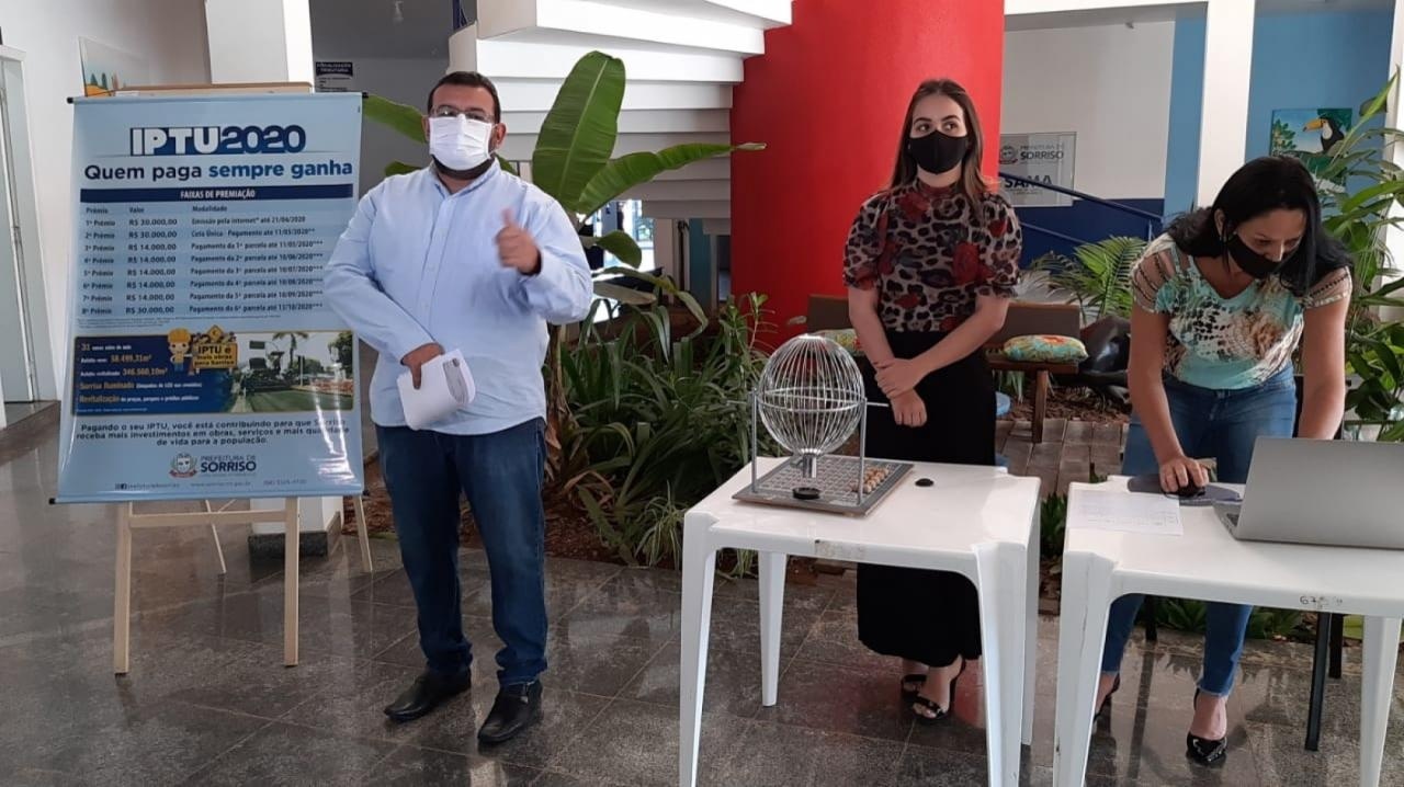 A Prefeitura de Sorriso sorteou ontem pela manhã (22) os 3 primeiros prêmios do Imposto Predial e Territorial Urbano (IPTU) de 2020. O sorteio foi realizado no Paço Municipal e totalizou R$ 74 mil. Os primeiros munícipes contemplados foram: o 1º prêmio de R$ 30 mil para impressão online foi para Elizandro Luiz de Campos, do bairro Jardim Califórnia; o 2º prêmio de R$ 30 mil para pagamento em cota única foi para Carlos José Cardoso, do bairro Novo Horizonte III; e o 3º prêmio, no valor de R$ 14 mil para pagamento em cota única ou para a opção parcelada, foi para Carlos Sílvio Kracieski, do bairro Village.
