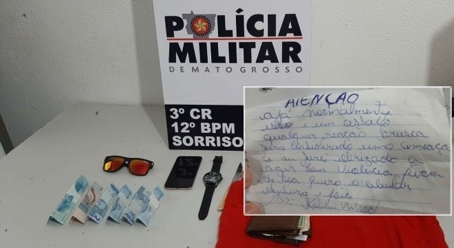 O homem, 29 anos (identidade não revelada), foi preso na quinta (20) após fingir ser cliente de um salão de beleza, situado no centro, e roubar cerca de R$ 150. À Polícia Militar, ele confessou que na tarde de terça (18) foi ele quem assaltou outro estabelecimento comercial de Sorriso, onde entregou um bilhete para anunciar o crime. No bilhete constava: “Atenção, aja normalmente. Isso é um assalto. Qualquer reação brusca será considerada uma ameaça e eu serei obrigado a agir com violência. Fica de boa. Quero o celular, dinheiro e joias. Assinado: Robin Wood (sic)”.