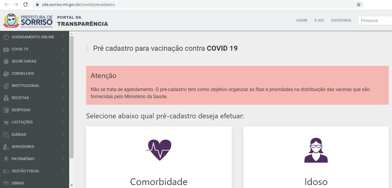 O pré-cadastro online para a vacinação contra a Covid-19, disponibilizado pela Prefeitura de Sorriso, irá abrir para mais um grupo: de quem tem comorbidades. O secretário de Saúde e Saneamento, Luís Fábio Marchioro, pontua que as pessoas devem acessar o pré-cadastro no site www.sorriso.mt.gov.br, inserir o nome no cadastro online e apresentar o atestado médico com a comprovação das comorbidades no ato da vacinação.