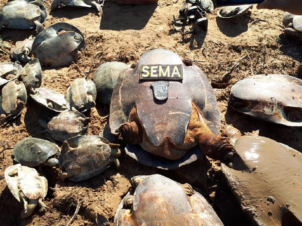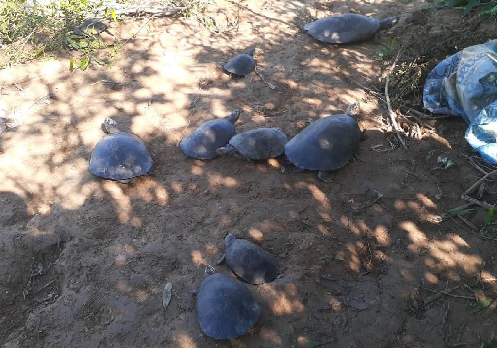 Um trabalho integrado entre agentes do Batalhão de Proteção Ambiental e da Secretaria de Estado de Meio Ambiente (Sema) resultou no resgate de dezenas de tartarugas encontradas em sacos no leito do Rio das Mortes, no Parque Estadual do Araguaia, em Novo Santo Antônio.