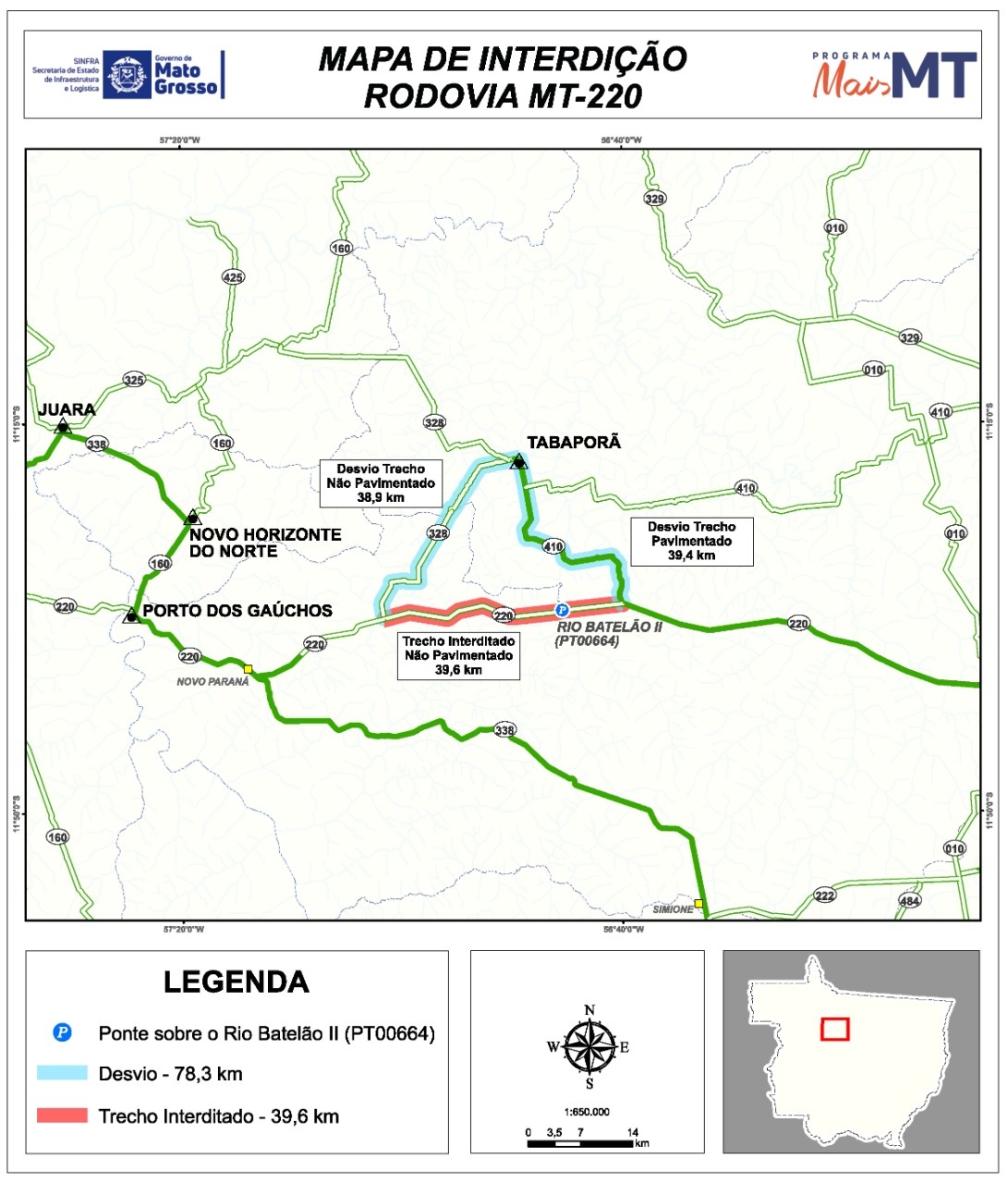 A Secretaria de Estado de Infraestrutura e Logística (Sinfra) informa que o tráfego na MT-220, entre o entroncamento da MT-338 e a MT-410, em Porto dos Gaúchos, está interditado para avanço das obras de construção da ponte de concreto sobre o Rio Batelão II.