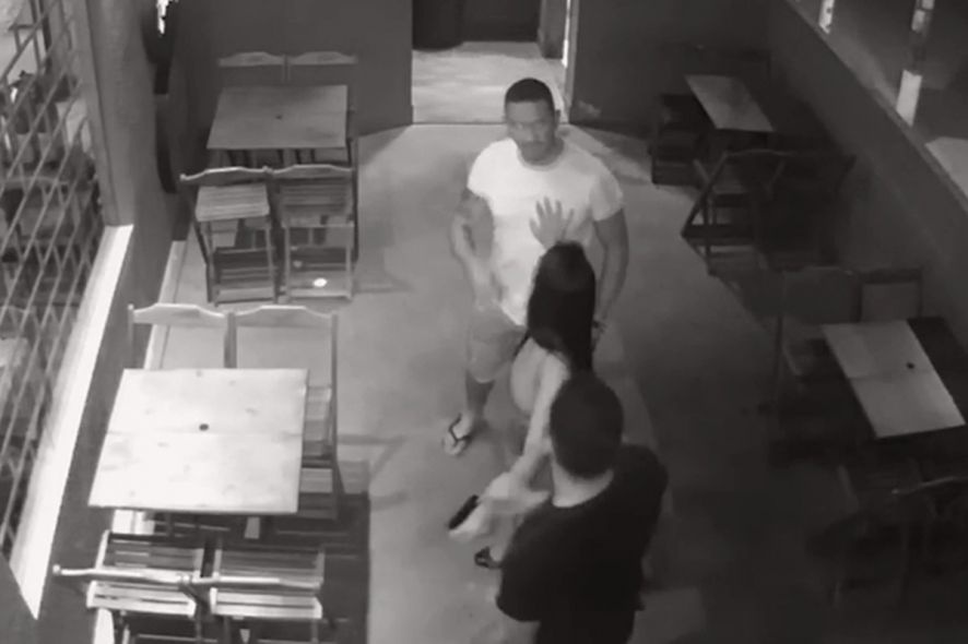 Em seguida ambos saem do banheiro ainda discutindo e com a mulher tentando conter o agressor, que, neste momento, chama com a mão o seu amigo, que ainda não havia aparecido nas imagens.