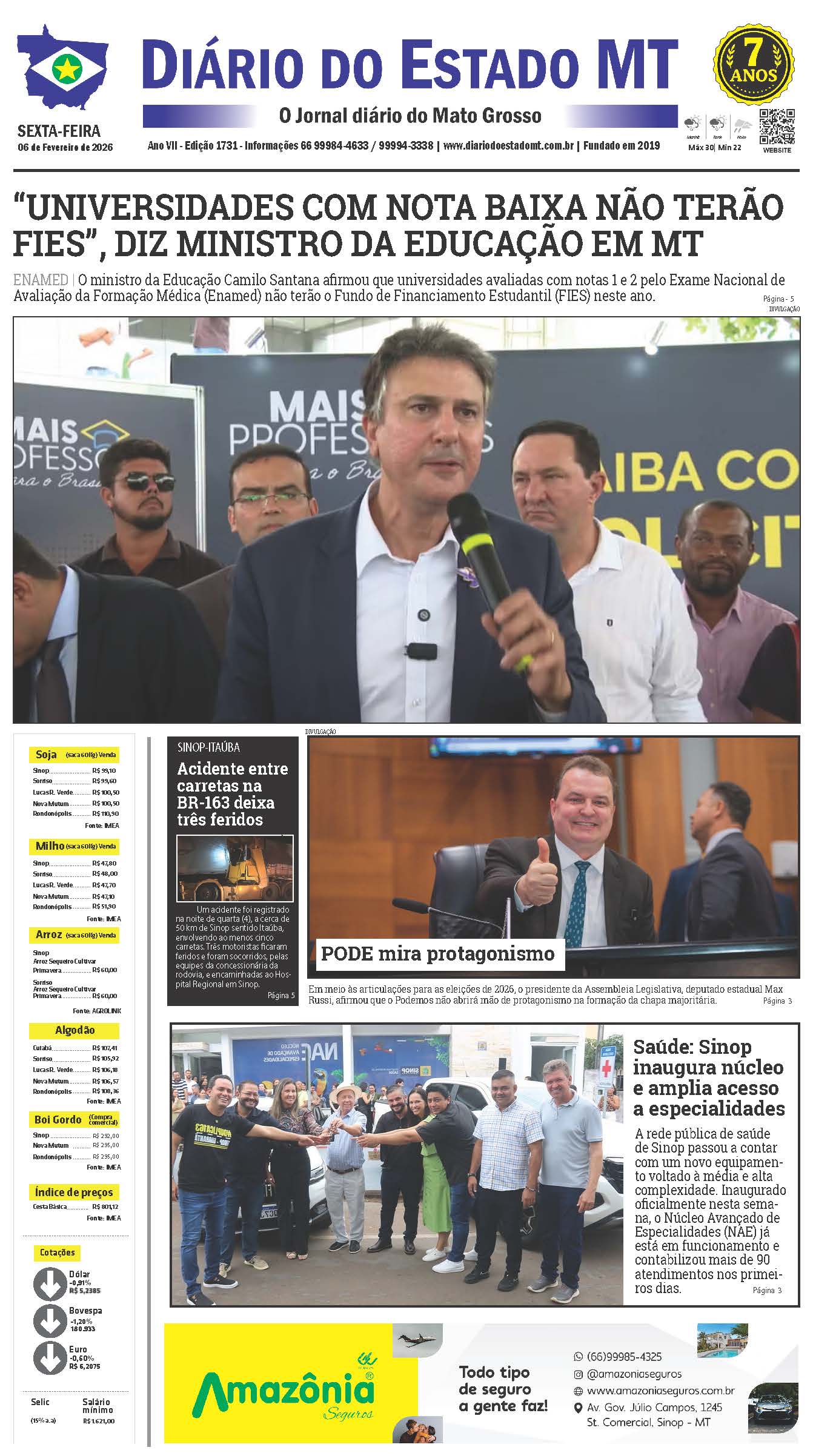 “Universidades com nota baixa não terão FIES”, diz ministro da Educação Acidente entre carretas na BR-163 entre Sinop e Itaúba deixa três feridos Senac celebra 80 anos com edição especial da Revista Senac Brasil Mercado de madeira em Mato Grosso movimenta R$ 3,17 bilhões em 2025 Câmara de Sinop inicia trabalhos com primeira sessão ordinária Instituto manifesta que ferrovia Sinop-Miritituba é “inviável” Previous Next Gemini supera 750 milhões de usuários ativos mensais, diz Google Reação arrasadora mostra caminhos que o Grêmio de Luís Castro pode seguir Wellington diz ter pedido a Gilmar flexibilização de pena de Bolsonaro Saúde: Sinop inaugura núcleo e amplia acesso a especialidades Agroallianz projeta faturamento de R$ 1 bilhão em até três anos Bombeiros salvam quatro filhotes de cachorro presos em vão entre paredes em Sorriso Brasil deve ampliar produção de etanol em 2026 com alta da cana Podemos mira protagonismo e reivindica espaço em chapa Classificados ANUNCIE NO CLASSIFICADO É GRÁTIS Fazenda a venda em Guarantã do Norte MT 🎯 R$ 10000000 Agilidade, Segurança e Tranquilidade. R$ SEU APP DELIVERY GRÁTIS R$ SEMI JÓIAS R$ VEJA MAIS Cotações Soja Milho Arroz Algodão Boi Jornal Online Edição nº1731 - 06/02/2026 Anuncie no Classificado × Titulo do Anuncio Valor: Inserir do foto: Descrição: Digite os caracteres da imagem: ENVIAR