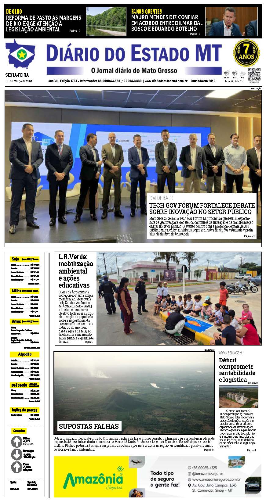 Primeiro campeão de MT, Paulistano está de volta e disputará a Segunda Divisão Sinop supera em 32,74% o número de emissões de Habite-se em fevereiro Agro cresceu 11,7% e liderou avanço do PIB brasileiro 2025 AL publica nomes dos deputados que vão compor a CPI da Saúde Reforma de pasto às margens de rio exige atenção à legislação ambiental Max aposta nos candidatos do Podemos; Scheila Pedroso é o nome do Nortão Previous Next Dilmar Dal Bosco destaca fortalecimento do turismo em Nobres PL descarta aliança com MDB ao Senado TSE aprova 7 resoluções para as eleições 2026 Caixa retoma financiamento para imóveis acima de R$ 2,25 milhões Receita apreende R$ 69 mi em ação especial anticontrabando Câmara vai acelerar análise de projeto que altera seguro rural Prefeitura de Campo Novo realiza esta semana campanha de doação Rachadura é identificada no Hospital Regional de Sorriso Classificados ANUNCIE NO CLASSIFICADO É GRÁTIS Fazenda a venda em Guarantã do Norte MT 🎯 R$ 10000000 Agilidade, Segurança e Tranquilidade. R$ SEU APP DELIVERY GRÁTIS R$ SEMI JÓIAS R$ VEJA MAIS Cotações Soja Milho Arroz Algodão Boi Jornal Online Edição nº1751 - 06/03/2026 Anuncie no Classificado × Titulo do Anuncio Valor: Inserir do foto: Descrição: Digite os caracteres da imagem: ENVIAR