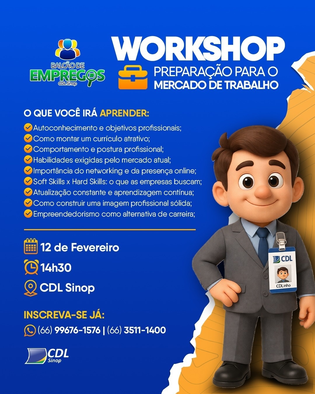 A CDL Sinop realiza no próximo dia 12 de fevereiro um Workshop de Preparação para o Mercado de Trabalho, voltado a pessoas que estão em busca do primeiro emprego ou desejam se recolocar profissionalmente. A atividade será realizada a partir das 14h30, na sede da entidade, e é gratuita. As vagas são limitadas.