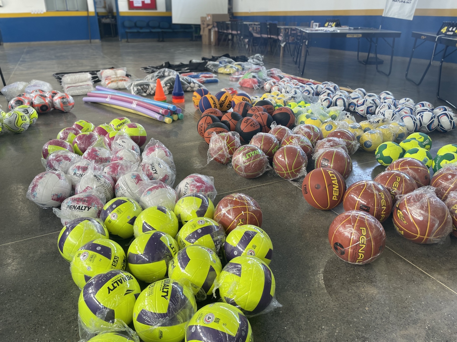 Entre os itens recebidos estão bolas, redes e materiais para futsal, basquete, handebol, voleibol e futebol society, além de mesas, raquetes, bolinhas e jogos de xadrez, ampliando as opções de treinamento e atividades para crianças e jovens.