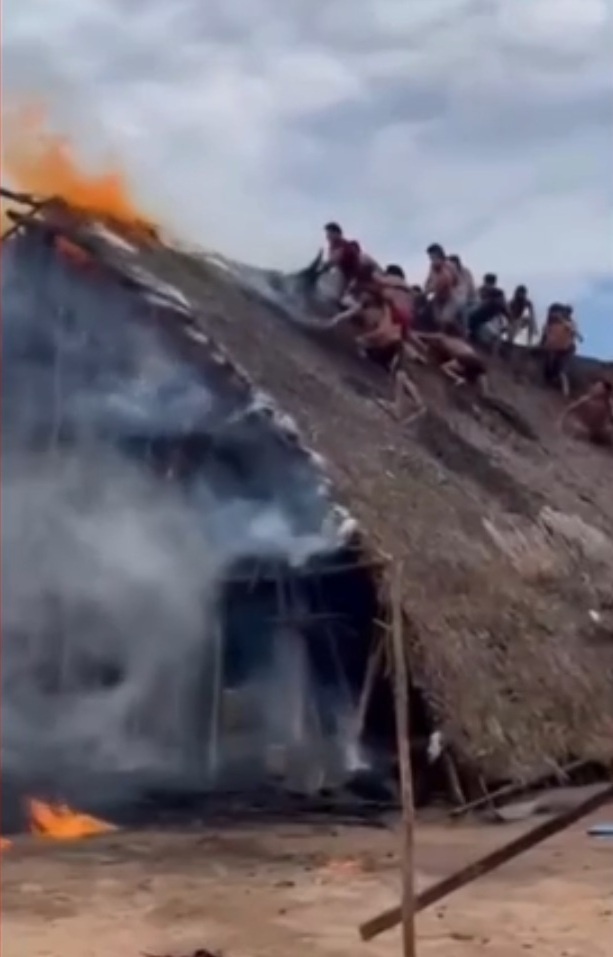 Imagens gravadas pelos próprios moradores mostram os indígenas combatendo as chamas que tomaram conta de uma casa, no domingo (26), na aldeia Dolowikwa/Kotakwinakwa, na Terra Indígena Enawenê Nawê, em Juína.