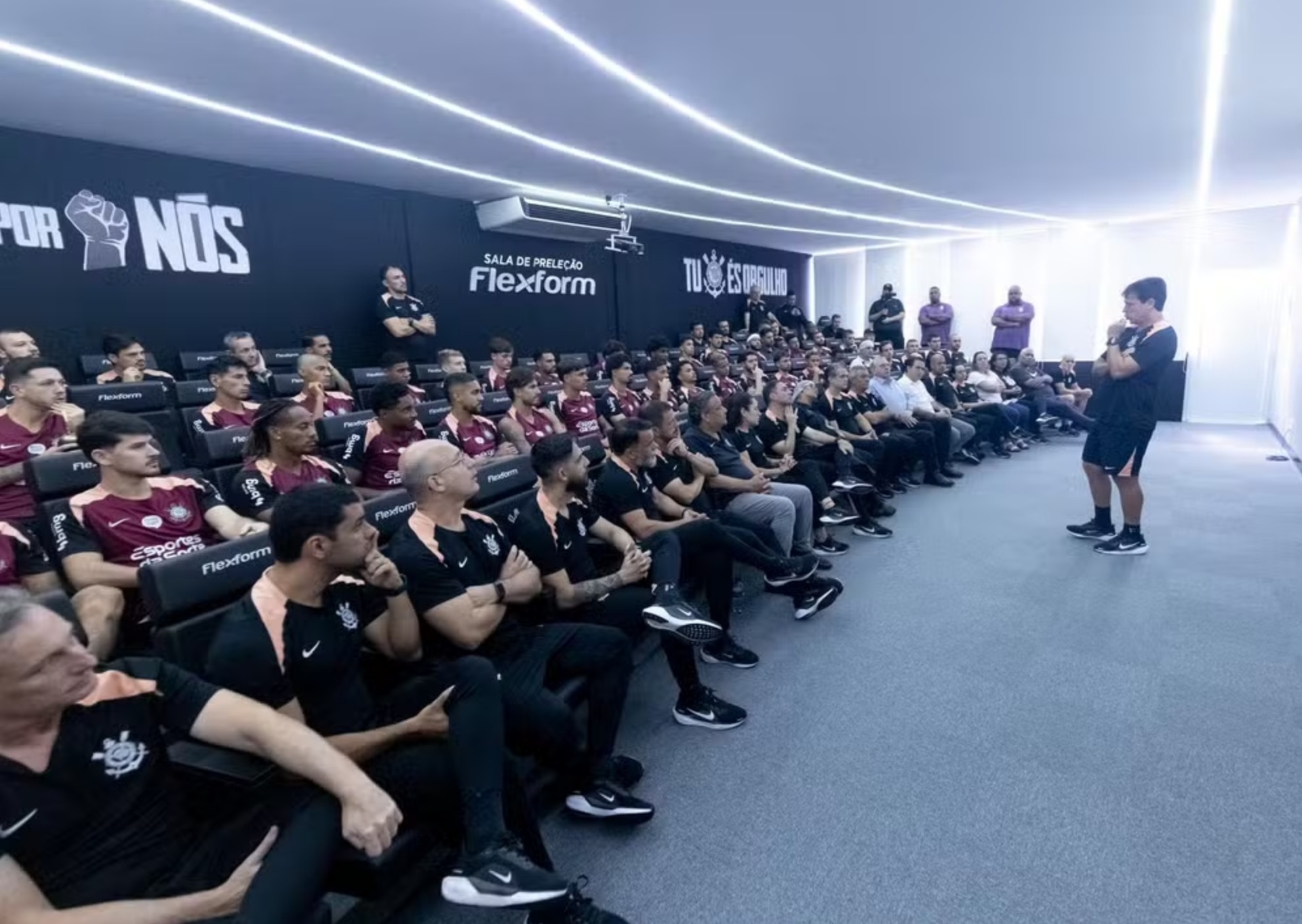 No bate-papo apenas com os atletas, o novo técnico do Corinthians orientou o grupo a buscar preservação no momento de crise. A equipe não vence há nove jogos, fez apenas cinco gols no período, despencou na tabela do Campeonato Brasileiro e está sendo alvo de protestos diários no centro de treinamento.