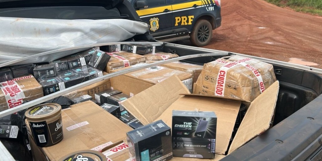 A Polícia Rodoviária Federal (PRF) apreendeu, na última sexta (23), mercadorias contrabandeadas e descaminhadas no Km 805 da BR-163 em Sinop. A ocorrência resultou na prisão de dois homens e na apreensão de milhares de itens, incluindo dispositivos eletrônicos de fumar, os chamados vaps (4.420 unidades entre essências e pods de diversas marcas), medicamentos de uso controlado (Tirzepatida, Lipoless, Durateston e Drostanolona) e eletrônicos de última geração.