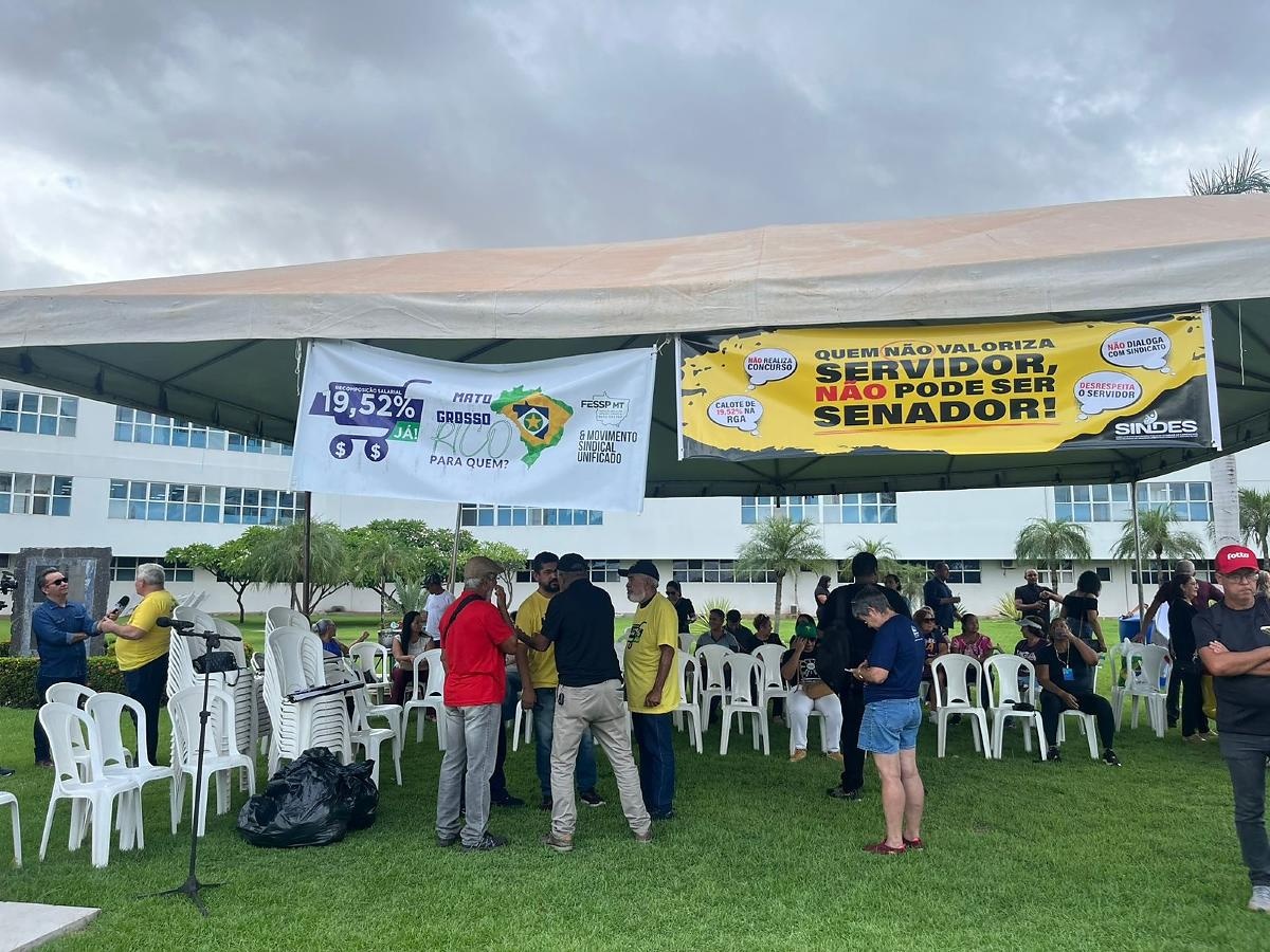 Os Servidores do Poder Judiciário de Mato Grosso levaram a mobilização para a porta da Assembleia Legislativa nesta quarta-feira, após terem a greve barrada por decisão judicial. Sem poder cruzar os braços, a categoria montou um acampamento em frente ao Parlamento como forma de pressão por reajuste salarial de 6,8% e mudanças no plano de carreiras.