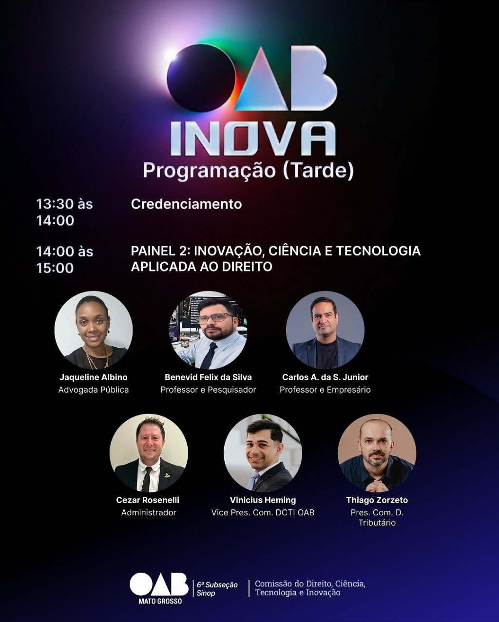O professor e CEO da SpectraX, Dr. Carlos da Silva Júnior, será um dos palestrantes do Painel 2 – Inovação, Ciência e Tecnologia Aplicada ao Direito, previsto para às 14h. O painel contará ainda com a participação de Jaqueline Albino (advogada pública), Benevid Felix da Silva (professor e pesquisador), Cezar Rosenelli (administrador), Vinicius Heming (vice-presidente da Comissão organizadora) e Thiago Zorzeto (presidente da Comissão de Direito Tributário da OAB Sinop).